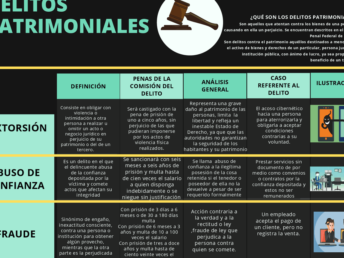 2. Delitos contra el patrimonio: Se refieren a los delitos que afectan los bienes y derechos de las personas. Dentro de esta categoría se encuentran el robo, hurto, estafa, apropiación indebida, entre otros.